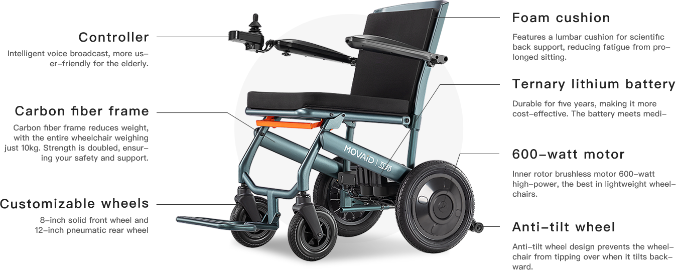 Imported full carbon fiber frame, the entire wheelchair weighs only 10kg. Lightweight yet sturdy, portable and safe, it offers a new way for travel, shopping, and everyday mobility.